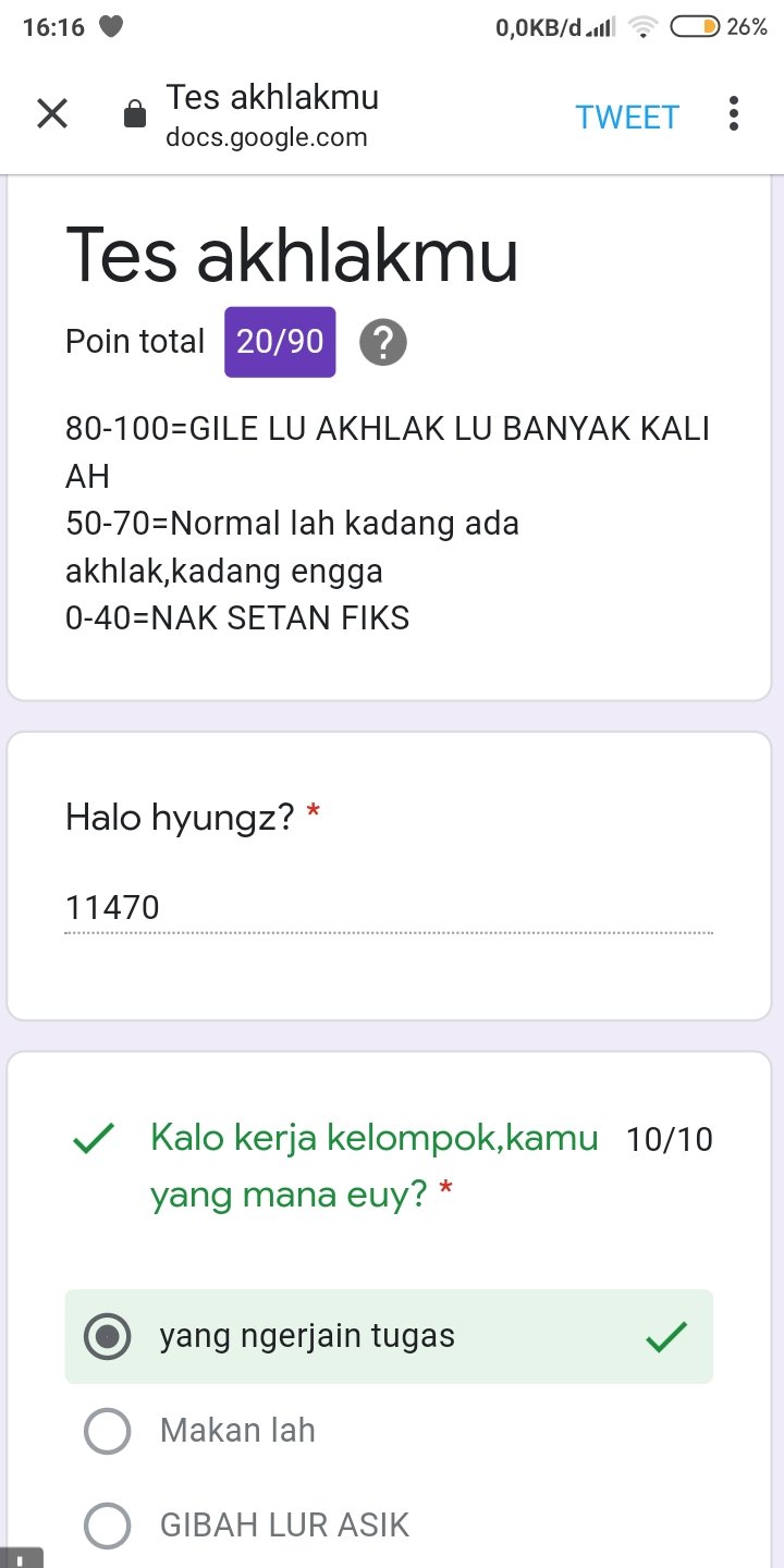 Tes Akhlakmu / Link Tes Akhlakmu Ngakak Docs Google Form Warganetplus62 Com - Sebenarnya tes ujian akhlakmu ini telah lama di buat, dan pada saat ini masih.. Dengan mengikuti tes akhlakmu ini, sobat bisa mengetahui tingkat akhlak sobat semua. Adalah sebuah soal yang mungkin bisa membantu kamu untuk menemukan tes akhlakmu adalah sebuah form yang mungkin kamu sedang ada pertanyaan tentang seberapa tingkat. Atau ada perintah dari orang tua tapi sobat tidak pernah nurut. Dan tes ini adalah tes akhlakmu docs gogoel form, tes ini buat kamu yang merasa kepribadian mu mempunyai akhlak yang tidak disukai banyak orang. Jadi ujian akhlak ini bukan 100 persen acuan buat kita mengetahui tingkat akhlaknya kita ya sob!.